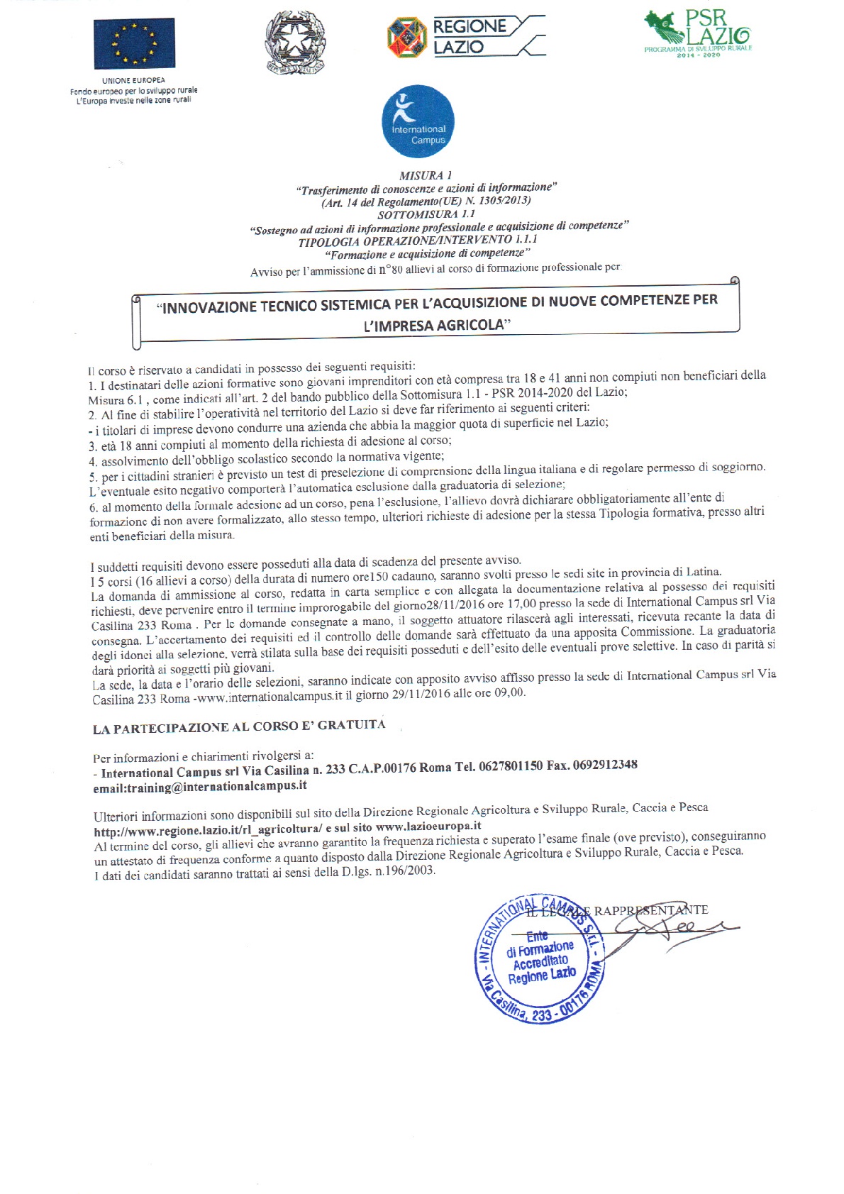 Si intitolano “Innovazione tecnico sistemica per l’acquisizione di nuove competenze per l’impresa agricola” i nuovi cinque corsi organizzati dall’International Campus nell’ambito delle azioni formative messe in campo dall’Unione Europea con i Piani di Sviluppo Rurale e attuate dalla Regione Lazio. I destinatari delle misure sono operatori giovani imprenditori del settore agricolo e forestale in età compresa tra i 18 e i 41 anni non compiuti.