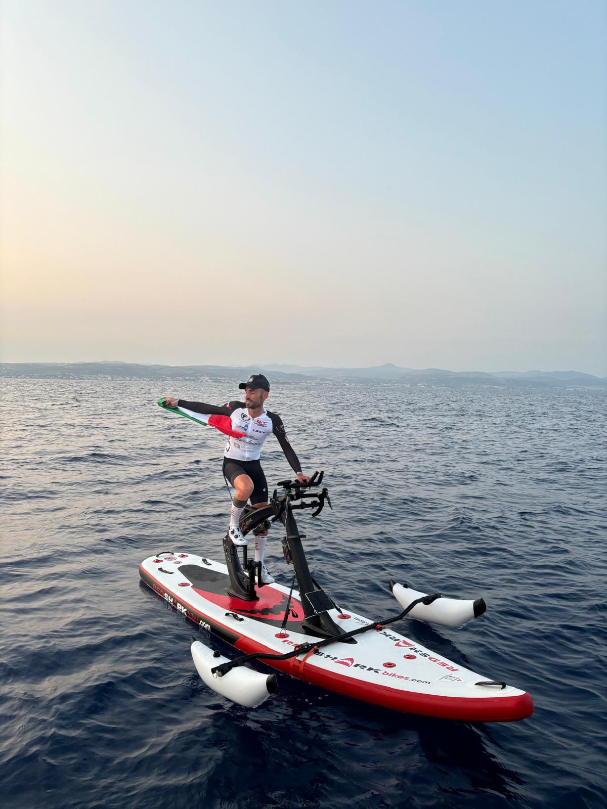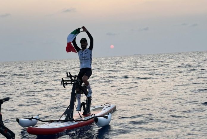 Vuole fare la traversata in sella alla Red Shark Bike. Una telaio di bici su una tavola. Alta ingegneria per carità, ma si confronta l’uomo e il mare. L’uomo è lo smisurato. Anche se Cristian è assistito da uno staff di prim’ordine. Ma poi c’è la fatica, che la resistenza non sconfigge, ma rimanda. Se vinci il record di dislivello in 24 ore, More Than Double Everesting, o quello della scalata del Passo Giau, non è scontato che reggi anche la forza delle onde. Tanto pedali in avanti, tanto e più rischi che il modo ondoso di rispedisca dietro. Il mare come una tavola è fantascienza.