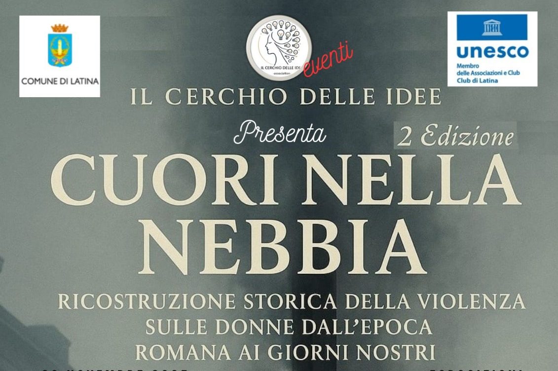 Torna domani, 23 novembre alle ore 16.00, al Circolo Cittadino “Sante Palumbo” di Latina la seconda edizione di “Cuori nella Nebbia” vede il patrocinio del Comune di Latina e l’adesione del Club per l’UNESCO di Latina. L’evento promosso dall’Associazione Culturale Il Cerchio delle Idee, nasce da un’iniziativa di Stefania Mariani, Daniela Stefanelli e Maurizio Castagna. L’iniziativa si inserisce nell’ambito della 26ᵃ Giornata Internazionale per l’Eliminazione della Violenza contro le Donne, istituita dall’Assemblea Generale delle Nazioni Unite, e intende sensibilizzare l’opinione pubblica su un tema ancora dolorosamente attuale. “Cuori nella Nebbia” è un viaggio nella storia e nella memoria collettiva, una ricostruzione che parte dall’epoca romana per arrivare ai giorni nostri, raccontando il lungo percorso della violenza e del riscatto femminile. Attraverso parole, arte e testimonianze, l’evento vuole rompere il silenzio che per secoli ha circondato le donne, restituendo voce, dignità e consapevolezza a chi ne è stata privata.