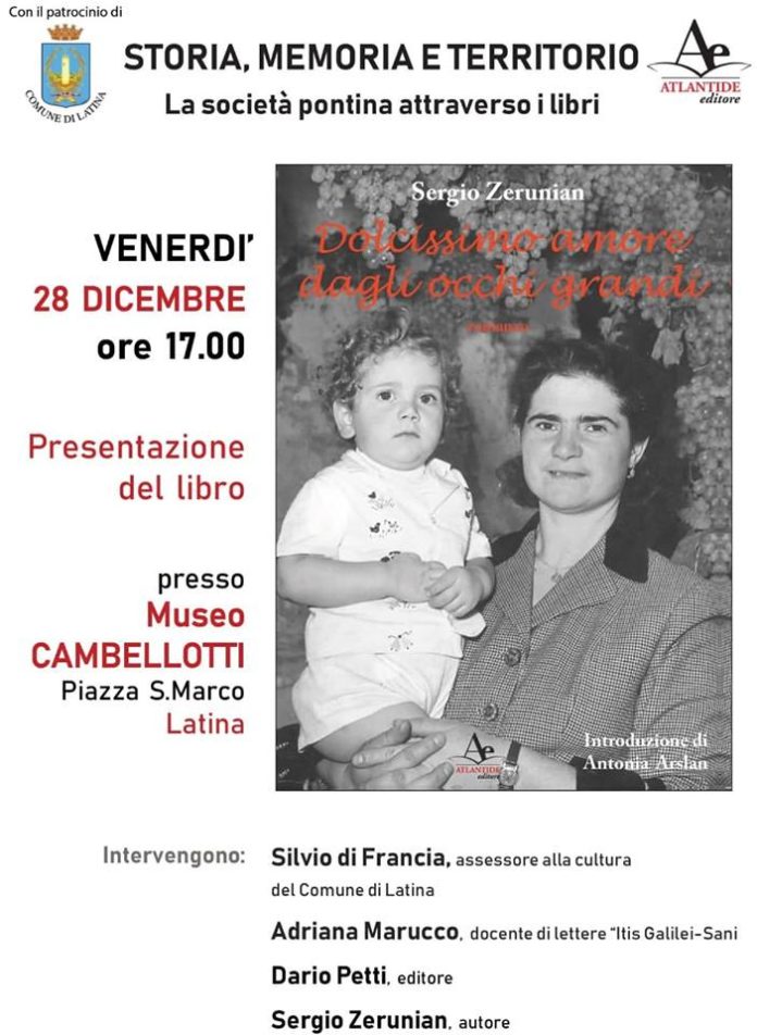 Terza e ultima puntata della rassegna “Storia, memoria e territorio. La società pontina attraverso i libri” promossa da Atlantide editore con il patrocinio del Comune di Latina. L’appuntamento è per venerdì 28 dicembre alle ore 17:00 presso il Museo Cambellotti in piazza San Marco. Protagonista il libro di Sergio Zerunian “Dolcissimo amore dagli occhi grandi”, vincitore del Premio Fiuggi Storia sezione Lazio meridionale. Nel volume si narra l’avvincente vicenda di una famiglia armena in fuga dal genocidio perpetrato dal governo turco, che nei primi del ‘900 si sottrae ad un tragico destino lasciando la regione dell’Anatolia e rifugiandosi nel paesino di Maenza sui Monti Lepini, dove metterà nuove radici. Si tratta di una storia vera, quella delle origini familiari dell’autore narrata in forma di romanzo. Autorevole l’introduzione al volume, ne è autrice infatti Antonia Arslan, archeologa, docente universitaria di letteratura italiana a Padova, ma soprattutto la maggiore scrittrice in Italia di vicende armene, da cui lei stessa discende. Finalista nel 2004 al premio Campiello con il libro “La masseria delle allodole” che ha ispirato l’omonimo film dei fratelli Taviani sul genocidio armeno.