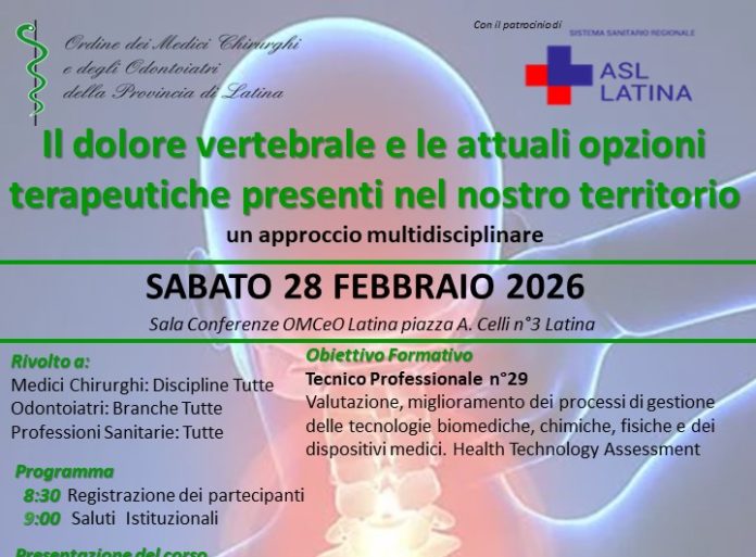 Sabato prossimo, 28 febbraio, alle ore 9.00, la Sala Conferenze dell’Ordine dei Medici Chirurghi e degli Odontoiatri della Provincia di Latina ospiterà un corso ECM dedicato al dolore vertebrale, una delle condizioni più diffuse e invalidanti della nostra epoca. L’iniziativa, promossa dall’OMCeO di Latina, nasce con l’obiettivo di mettere a confronto i professionisti della salute che ogni giorno si occupano di questa problematica, per migliorare la collaborazione tra ospedale e territorio e costruire percorsi di cura più condivisi ed efficaci. Responsabili scientifici dell’evento saranno il dottor Ermanno Notarianni e il dottor Giuseppe Pelle, che guideranno i lavori puntando su un dialogo basato sia sulle più recenti evidenze scientifiche sia sull’esperienza maturata nel contesto locale.