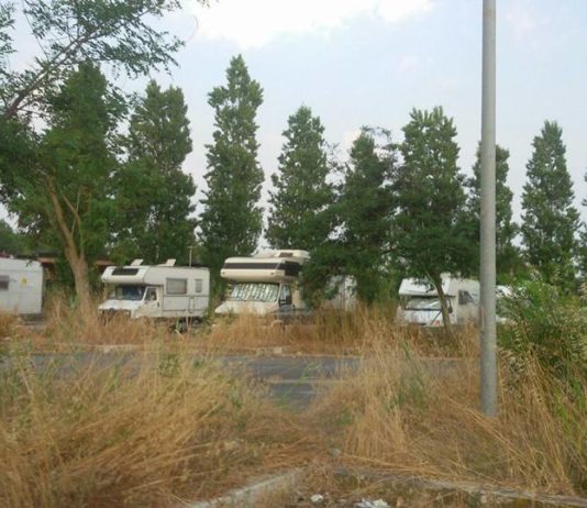 Latina, accampamento rom nel parcheggio di Vasco de Gama. Serie crescente di roulotte tra le sterpaglie