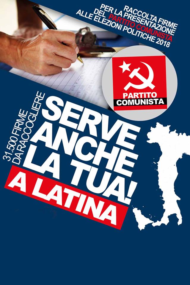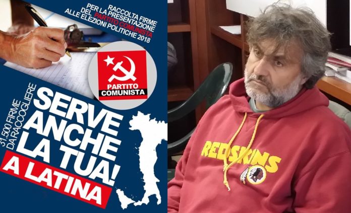 “Dopo anni di assenza dei comunisti nella principale competizione elettorale, che ha privato i lavoratori dell’unico voto utile alla difesa dei propri interessi, crediamo sia necessario restituire alla classe operaia e alle classi popolari la possibilità di tornare a votare per il Partito Comunista”. Il pontino Sergio Sciaudone, segretario provinciale del Partito comunista, ha avviato la raccolta di firme necessarie alla presentazione delle liste comuniste alle elezioni nazionali del 4 marzo 2018. Obiettivo: 31.500 sottoscrizioni. “Anche in provincia di Latina, puoi fare la tua parte lasciando una firma ai nostri banchetti”, è l’appello lanciato questa mattina sui social dal segretario della provincia di Latina del partito della falce e martello. Sciaudone è doppiamente impegnato perché la raccolta di firme vale anche la sua candidatura al Parlamento italiano: il suo nome è in lista per il collegio plurinominale Lazio 2 della Camera dei deputati.