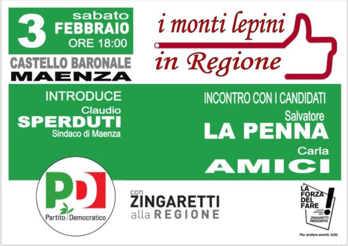 Incontro pubblico sabato, 3 febbraio, a Maenza con i candidati del Pd al consiglio regionale del Lazio Salvatore La Penna e Carla Amici. L’appuntamento è alle 18 al castello baronale. A fare gli onori di casa e ad introdurre gli esponenti dem in corsa al fianco di Nicola Zigaretti sarà il sindaco di Maenza Claudio Sperduti. L’evento, il primo di una lunga serie organizzato da Sperduti, verterà sulle tematiche comuni al territorio, dai trasporti alla gestione dei rifiuti, dalla sanità (con particolare riferimento al futuro delle strutture di Priverno e Sezze), allo sviluppo rurale. Ai candidati in corsa il sindaco di Maenza chiederà un esplicito impegno per la soluzione dei problemi che le amministrazioni comunali incontrano nella gestione quotidiana dei grandi temi.