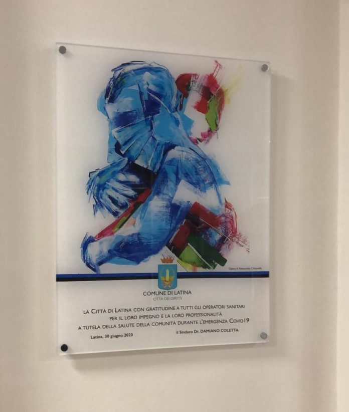 E’ stata scoperta poco fa la targa davanti all’ingresso del Santa Maria Goretti, per ringraziare gli operatori sanitari, che durante questa emergenza Covid stanno dando il massimo sul posto di lavoro. Folta la platea, composta da medici, infermieri e istituzioni. L’opera, dell’artista Alessandra Chicarella, raffigura un abbraccio tra due operatori che ricorda quello alla chiusura del reparto Covid-19 presso la Medicina d’urgenza del Goretti dopo la fase più acuta dell’emergenza.