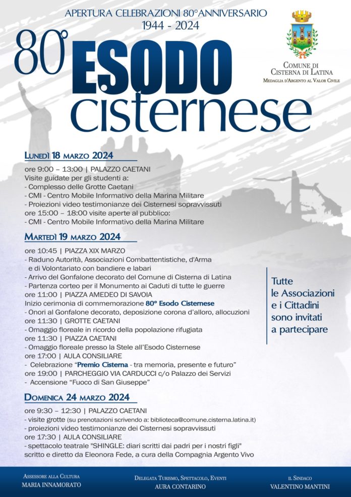 Martedì 19 marzo alle ore 10:45, in piazza XIX Marzo, si terrà il raduno delle autorità, associazioni combattentistiche, d’Arma e di volontariato con bandiere e labari, del Gonfalone decorato del Comune di Cisterna di Latina e la formazione e partenza del corteo che sfilerà su un tratto di Corso della Repubblica fino a raggiungere piazza Amedeo di Savoia, dove, dinanzi al Monumento ai Caduti di tutte le guerre, alle ore 11:00 avrà inizio la cerimonia di commemorazione dell’80° Esodo Cisternese.