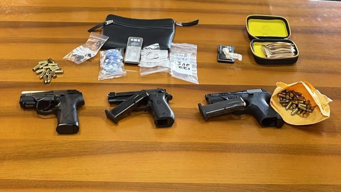 In un locale condominiale sono state trovate tre pistole con matricola abrasa, oltre 70 cartucce e 25 grammi di cocaina già divisa in dosi. Tutto è stato sequestrato e inviato ai Ris per le analisi.