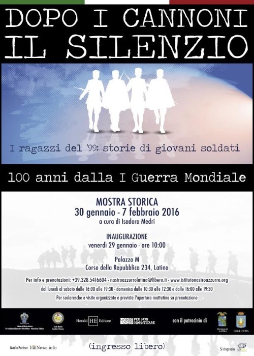 Cento anni dopo lo scoppio della Prima Guerra Mondiale, la Herald Editore in collaborazione con l’Istituto del Nastro Azzurro – Federazione Provinciale di Latina – e la Scuola Nautica della Guardia di Finanza, promuove la mostra storica “Dopo i Cannoni il Silenzio – I ragazzi del ’99: storie di giovani soldati”.