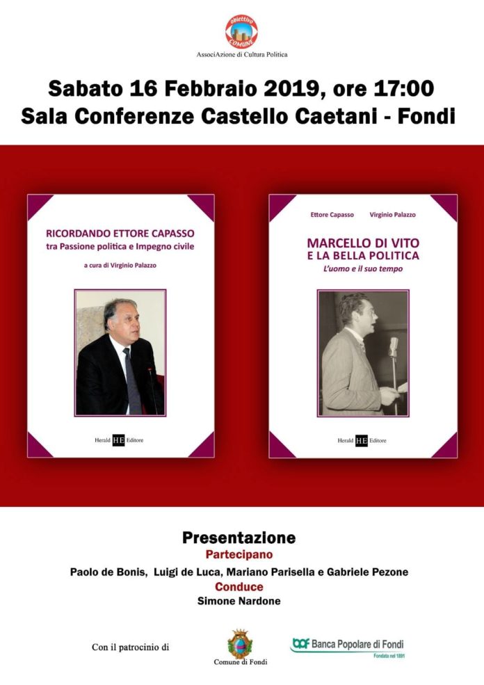 Ricordando Ettore Capasso e Marcello Di Vito, sarà possibile ripercorrere un pezzo di storia fondana con la presentazione del libro “Ricordando Ettore Capasso tra passione politica e impegno civile” a cura di Virginio Palazzo e la seconda edizione di “Marcello Di Vito e la bella politica. L’uomo e il suo tempo” di Ettore Capasso e Virginio Palazzo.