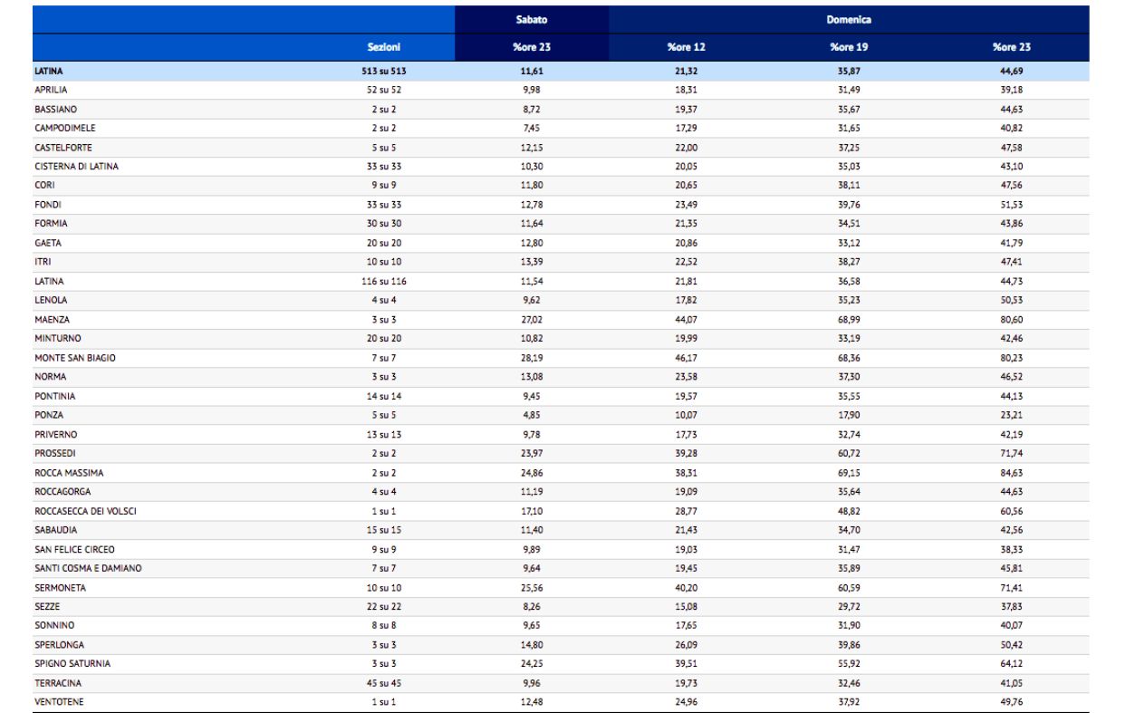 A diffondere i dati è stato il Ministero dell’Interno, Rocca Massima è il comune con l’affluenza più alta. Spigno Saturnia invece quello con la percentuale più bassa.