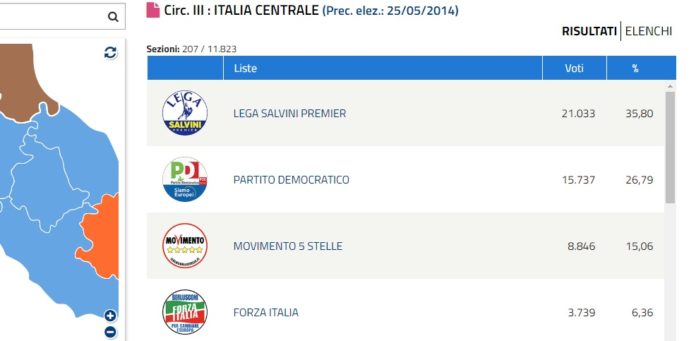 Europee: la Lega avanti su tutti nei primissimi risultati relativi alla circoscrizione Italia Centro. I voti andati al Carroccio relativi a 265 sezioni su 11.823 sono stati il 36,33%.