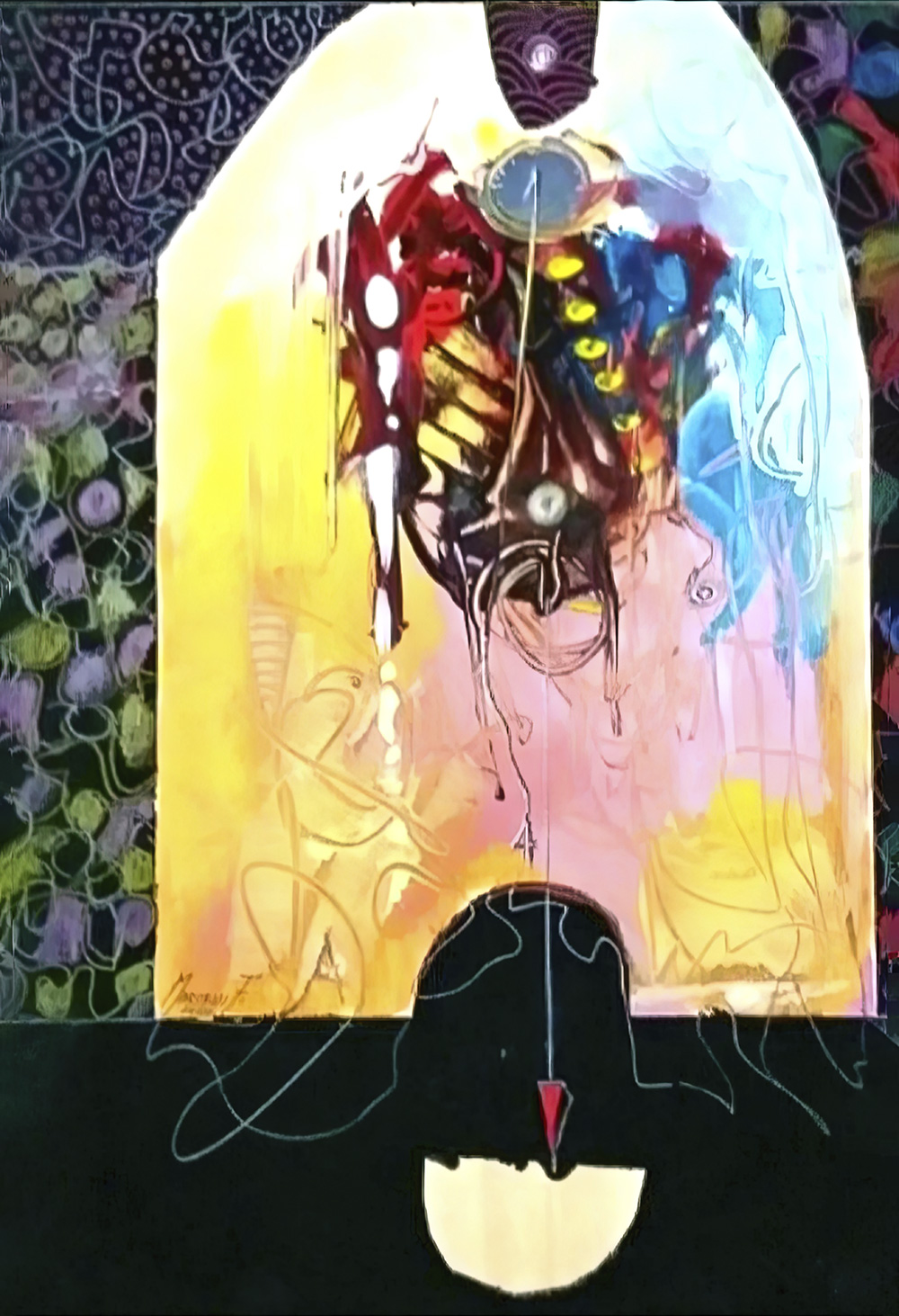 Una pittura chiaramente astratta che non rinuncia però a forme conosciute, personaggi evanescenti, azioni accennate in un turbine di colori e linee.