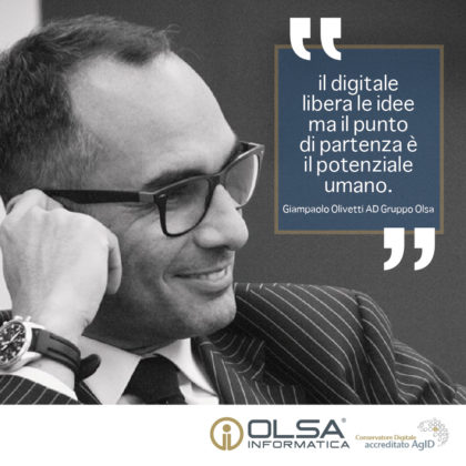 La Olsa Informatica, 40 anni di attività, ha cinque stabilimenti di produzione e oltre 70 dipendenti. Fondata nel 1976 da Riccardo Olivetti, oggi diretta da suo figlio Giampaolo Olivetti, la Olsa Informatica SpA è un’azienda flessibile e moderna specializzata in business process e document management. E’ impegnata stabilmente nella digital transformation di clienti pubblici e privati nei diversi settori distribuzione, farmaceutico, automotive e petrolifero. Dal 2016 è accreditata ufficialmente nell’albo dei Conservatori Accreditati AgID (Agenzia per l’Italia Digitale).