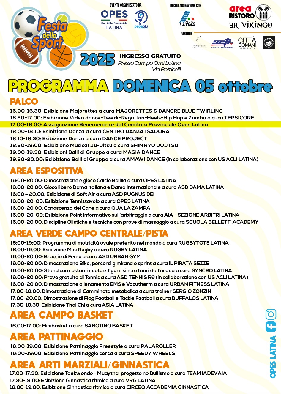 “È tutto pronto – commenta Daniele Valerio, presidente del comitato provinciale Opes Latina – invitiamo tutta la cittadinanza a partecipare attivamente perché sarà un’occasione unica per scoprire nuove passioni e condividere momenti di allegria e sport. Ringraziamo i nostri partner Net In Progress, Seti Srl, Associazioni Culturale Città Domani e Osteria da Giorgione”.