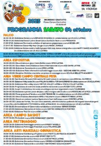 Nell’area espositiva, dalle 16 alle 20 dimostrazione e gioco calcio balilla a cura di Opes Latina, gioco libero di dama italiana e dama internazionale a cura della asd Dama Latina, esibizione di Soft Air a cura della asd Pugnus Dei, tennistavolo a cura di Opes Latina, conoscenza del cane a cura di Qua La Zampa, esibizione e point informativo sull’arbitraggio a cura AIA – Sezione Arbitri Latina e discipline olistiche e tecniche con prove di massaggio a cura della Scuola Belletti Academy.