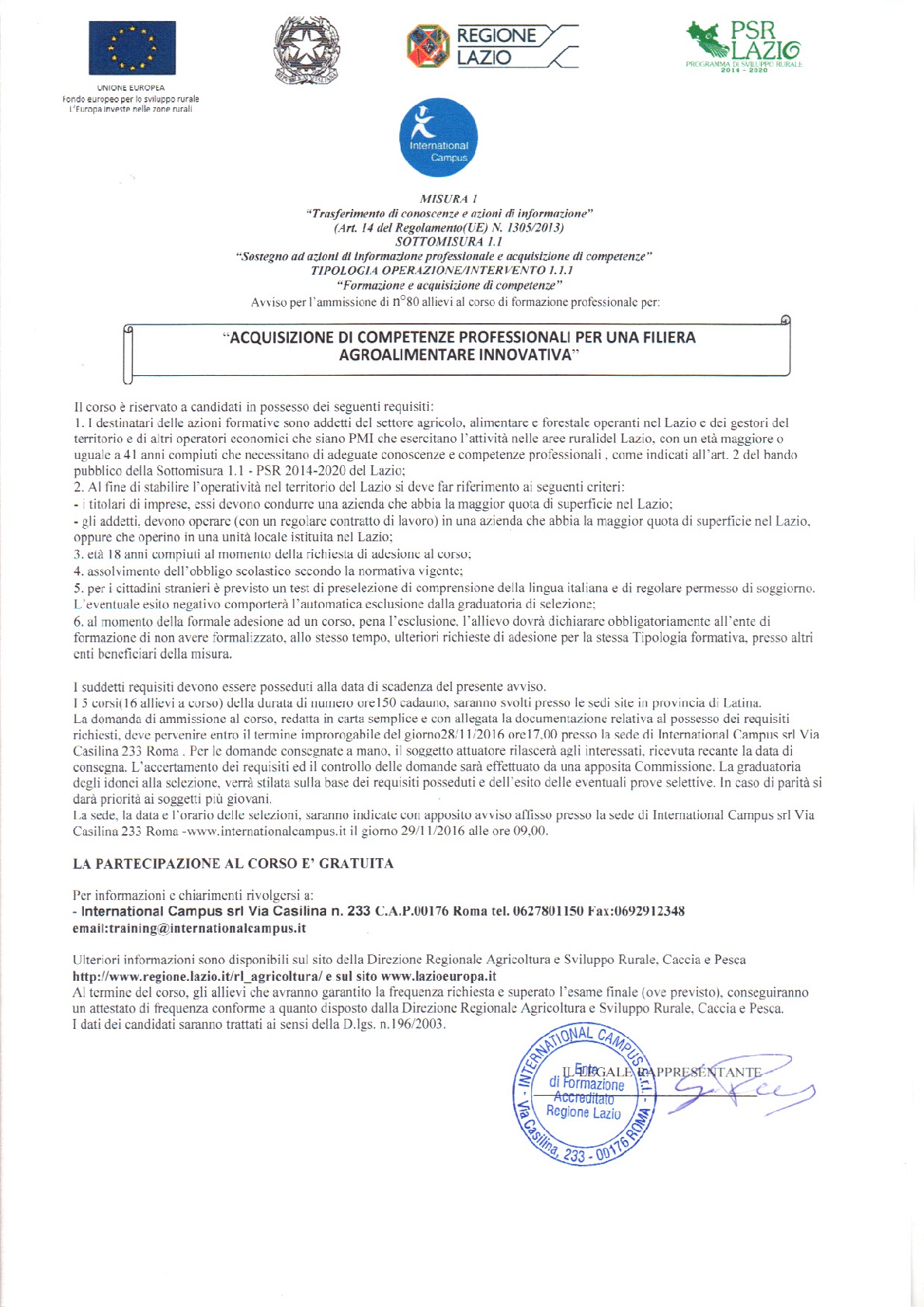 Si intitola “Acquisizione di competenze professionali per una filiera agroalimentare innovativa” il corso organizzato dall’International Campus nell’ambito delle azioni formative messe in campo dall’Unione Europea con i Piani di Sviluppo Rurale e attuate dalla Regione Lazio. I destinatari delle misure sono operatori del settore agricolo, alimentare e forestale operanti nel Lazio e altri operatori che siano PMI che esercitano l’attività nelle aree rurali del Lazio.