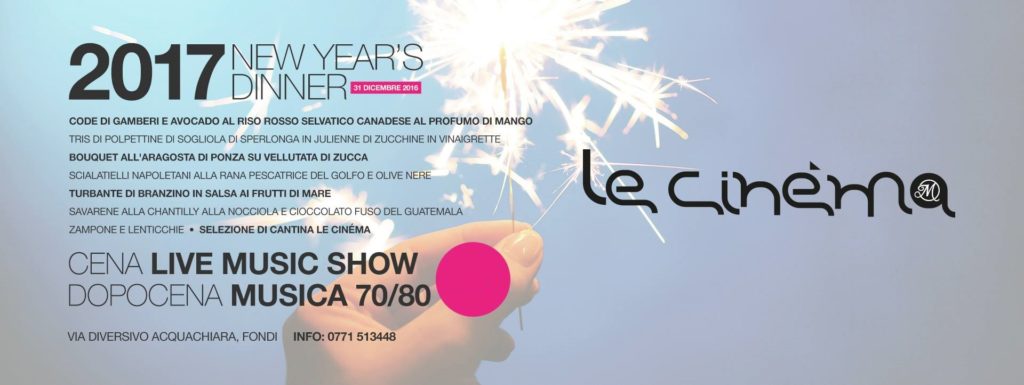 Con un nome così la festa di capodanno de Le Cinèma, il locale del manager fondano Roberto Massarone, non poteva che essere dedicata al mondo della celluloide. In modo assolutamente originale, Le Cinèma scardina le regole del look di capodanno, e suggerisce agli ospiti un dress code che nel totale o nel particolare ricordi un film famoso. Un’idea divertente per celebrare in modo singolare il gran cenone che saluta l’arrivo di un nuovo anno. Scenografie, immagini e filmati ricorderanno i migliori film di sempre, in una location di rilievo, preparata a festa, dove il bianco e il grigio giocano effetti cromatici glamour e la presenza degli arredi è stata studiata nei minimi particolari. La colonna sonora rigorosamente dal vivo simulerà una radio d’epoca sintonizzata sulle più belle canzoni degli ultimi settantanni. Una miscela di ritmi, suoni e cori, che saranno proposti con sapienza e maestria, con un unico scopo: far divertire tutti. Un turbine di balli e canti che sono il sale dell’evento più sentito dell’anno. La cena, sontuosa, con un menù studiato per l’occasione sarà il giusto compendio di un evento pensato, organizzato e realizzato per soddisfare i desideri degli ospiti. Le Cinèma si trova a Fondi in via Diversivo Acquachiara 88. Per informazioni e prenotazioni chiamare i numeri: 0771513448.