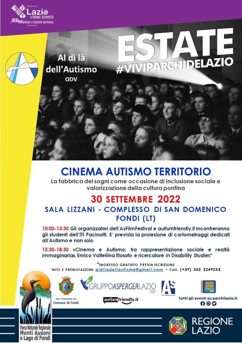 Venerdì 30 settembre nella Sala Lizzani a Fondi, l’iniziativa organizzata da l’Associazione di Volontariato Al di là dell’Autismo ODV, in collaborazione con il Gruppo Asperger Lazio ODV e l’associazione culturale Not equal e il patrocinio del Comune di Fondi e dell’Ente Parco Naturale Regionale Monti Ausoni e Lago di Fondi, promuove l’evento “Cinema, autismo e territorio”, per promuovere l’inclusione sociale tramite il grande schermo.