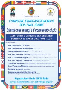 Al termine dei lavori, i presenti si sposteranno nel chiostro di San Domenico per una degustazione di cibi locali ed etnici. I cittadini fondani e appartenenti ad ogni comunità avranno quindi la preziosa occasione di fare un giro del mondo culinario e di esplorare, tramite assaggi e pietanze tipiche, le tradizioni della terra che li ospita e del vicino di casa come del collega proveniente da un’altra nazione.