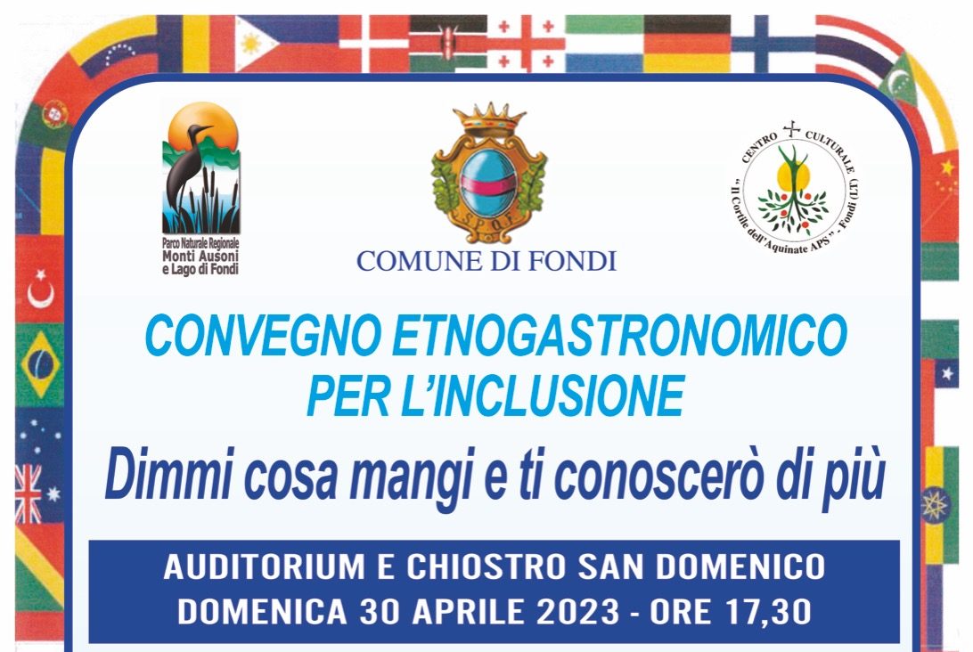Domani, a partire dalle 17:30, presso l’auditorium comunale “Sergio Preti”, nell’ambito del convegno etnogastronomico per l’inclusione “Dimmi cosa mangi e ti conoscerò di più”, organizzato dal Comune di Fondi e dal Centro culturale Il Cortile dell’Aquinate Aps, con il supporto e il patrocinio del Parco naturale regionale dei Monti Ausoni e Lago di Fondi.