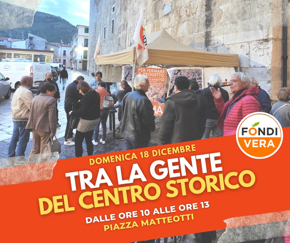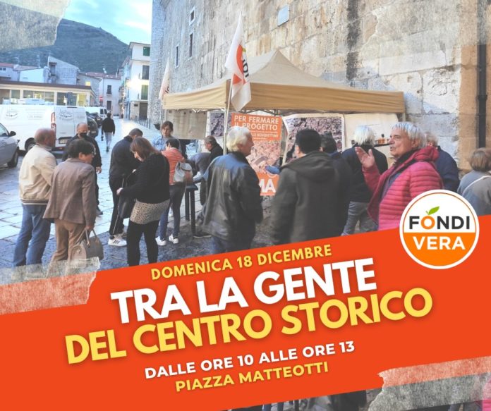 Continua la Campagna di Fondi Vera “Tra la gente. Come sempre” con una nuova tappa del tour nei quartieri prevista per domani 18 Dicembre, dalle ore 10 alle ore 13, nella centralissima Piazza Matteotti, ai piedi del Castello Caetani, dove verrà installato un Gazebo ed il Movimento di Partecipazione Politica incontrerà i Cittadini.