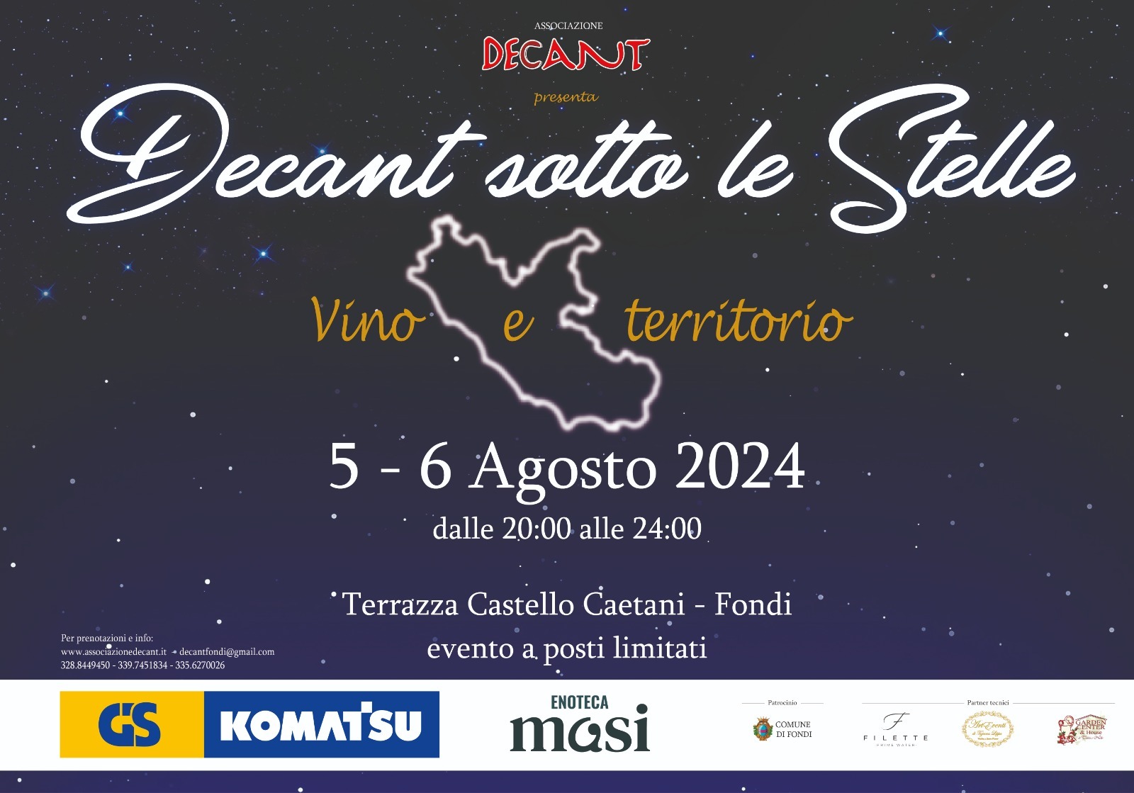 Una nuova edizione del percorso enogastronomico dedicato ai Vini del Lazio e alla gastronomia pontina, organizzato da Associazione Decant, va in scena nei giorni 5 e 6 agosto sulla terrazza del Castello Caetani che, imponente, domina la città di Fondi (LT).