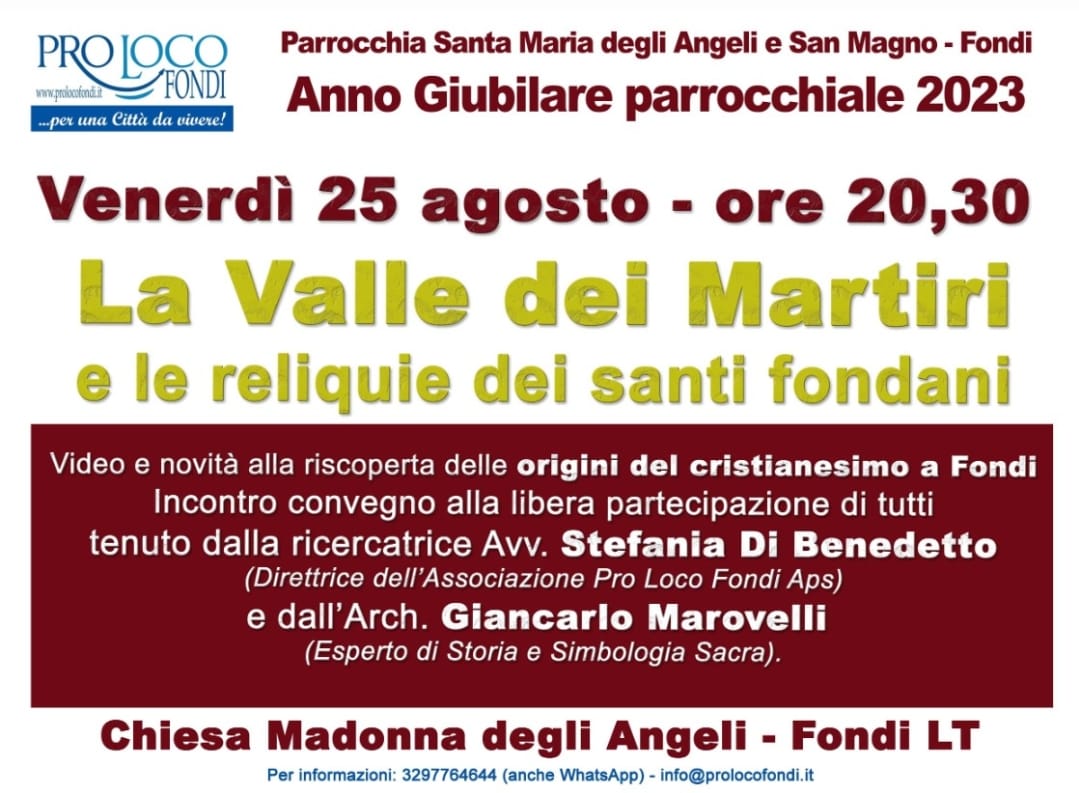 Venerdì 25 agosto 2023, alle ore 20:30, nella Chiesa della Madonna degli Angeli a Fondi LT, ci sarà l’incontro convegno sul tema “la Valle dei Martiri e le reliquie dei santi fondani”