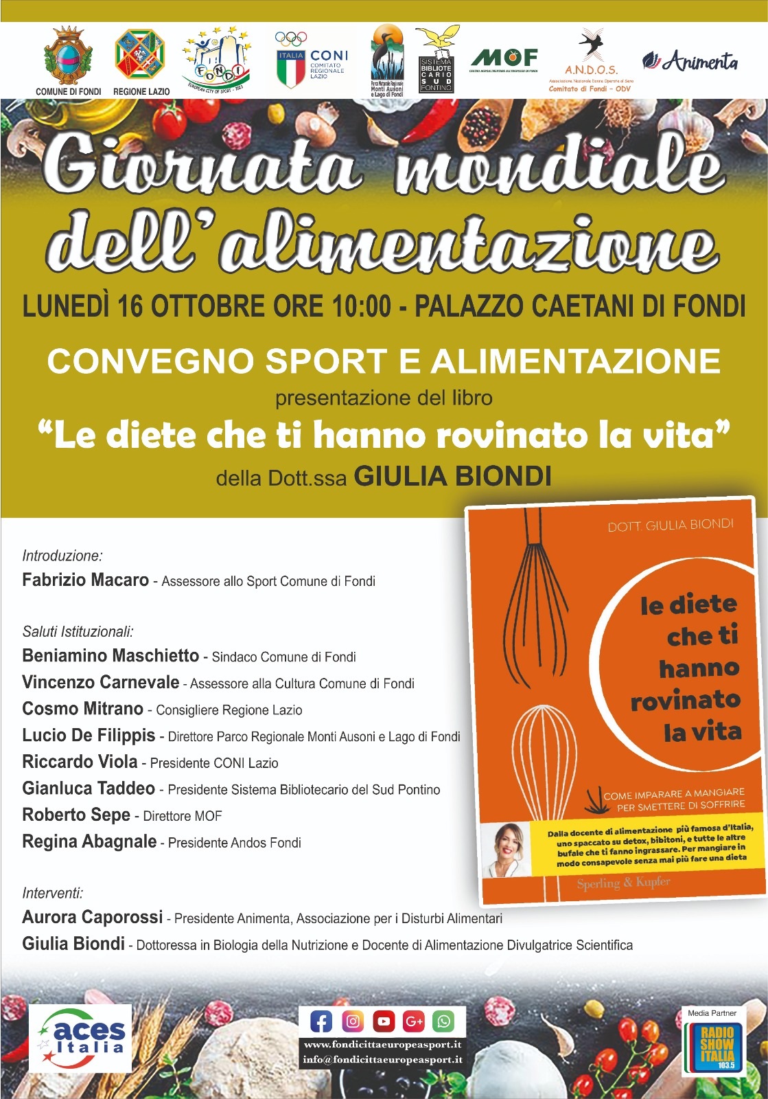 Il 16 ottobre a Palazzo Caetani, con inizio alle ore 10:00, si terrà la presentazione del libro di Giulia Biondi “Le diete che ti hanno rovinato la vita”. L’autrice, dottoressa in biologia della nutrizione, esperta di educazione alimentare e influencer, dialogherà con il pubblico composto prevalentemente dagli studenti delle scuole superiori della città. L’appuntamento, organizzato dal Comune di Fondi in occasione della Giornata mondiale dell’alimentazione, gode del patrocinio del Sistema Bibliotecario del Sud Pontino e del Parco naturale regionale dei Monti Ausoni e Lago di Fondi e rientra nel programma ufficiale “Fondi città europea dello sport”.