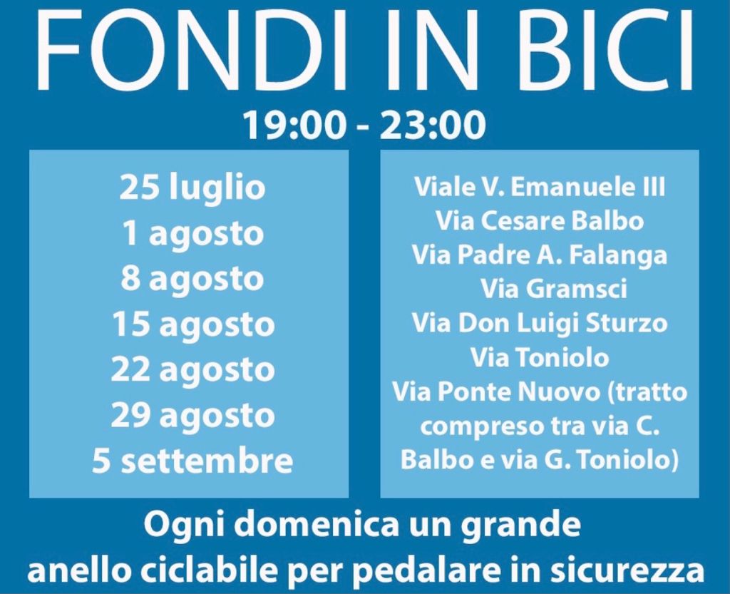 A gran richiesta, dopo il successo degli anni passati, torna “Fondi in Bici”, un’iniziativa volta a promuovere l’uso delle due ruote in sicurezza che ogni domenica, dal 25 luglio al 5 settembre, dalle 19 alle 23, vedrà il centro cittadino chiuso al traffico, ma aperto a biciclette e monopattini.