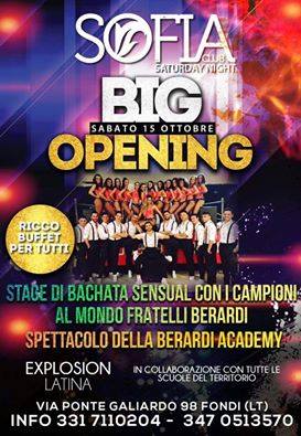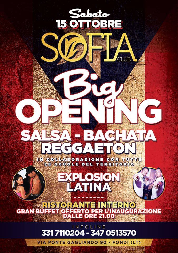 Archiviata l’estate 2016, dove ancora una volta il sud pontino è stato protagonista indiscusso della nightlife della provincia, il Sofia di Fondi apre le porte per la nuova stagione invernale. Da sei anni sulla cresta dell’onda, la discoteca più conosciuta del centro sud Italia presenta un programma di eventi straordinari e grandi personaggi mai saliti sulla consolle del locale. Da sabato 15 ottobre la location alza il sipario sulle tante novità. La prima è sicuramente quella che vede l’inserimento della ristorazione. Ed è per questo che proprio all’inaugurazione è previsto un ricco buffet per tutti. Dopo di che, nella sala centrale, via alle danze: bachata, salsa, raggaeton, in collaborazione con Explotion Latino e le migliori scuole del territorio. Sabato in esclusiva lo stage dei fratelli Antonio e Jasmina Berardi campioni del mondo di Bachata Sensual. Una grande opportunità per gli amanti del genere ed i curiosi, mentre nella sala Vintage la musica sarà solo ed esclusivamente dedicata agli anni 90 con i dj Paolo R e Riccardo Di Vizio con la voce di Sandrino. Insomma un sabato dedicato ad un pubblico dal target vario, che si potrà divertire attraverso diverse sonorità assolutamente di moda, e anche vintage. Questo nell’attesa di ospiti d’eccezione che una volta al mese saranno protagonisti della scena in speciali one night dal nome Believe in Music. La prima sabato 19 novembre. In arrivo anche la grande festa di Halloween, un momento molto atteso dal pubblico. Sofia Club via Ponte Gagliardo, 90 Fondi. Info: 3317110204 – 3470513570.