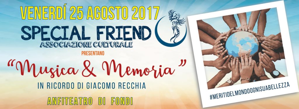 L’evento MUSICA & MEMORIA, arrivato alla terza edizione, è ideato, realizzato e promosso dall’associazione ‘Special Friend’. L’associazione nasce da un gruppo di ragazzi per ricordare un amico speciale, Giacomo Recchia, e ha come fine quello di creare iniziative continue nel tempo per la raccolta fondi da destinare ad attività di assistenza sociale per persone disabili o, più in generale, per le persone bisognose. Musica & Memoria rende omaggio a Giacomo, una persona che rideva alla vita. Così il 25 agosto, giorno del suo compleanno, nel nome del grande sorriso con cui ha vissuto e che ha regalato ogni giorno a tutte le persone a lui vicine, l’Associazione Special Friend vuole ricordarlo, provando a donare lo stesso sorriso a persone meno fortunate, attraverso un aiuto mirato, sia economico che morale. Anche quest’anno l’evento si svolgerà nel suggestivo Anfiteatro De Gasperi di Fondi. Per l’occasione la piazza diventerà un tripudio di colori e vitalità, grazie al Truccabimbi, e alla presenza dell’associazione ARS ET VIS, che curerà una mostra artistica di giovani locali con la realizzazione di una tela estemporanea. Alle ore 21.00 aprirà lo spettacolo lo scrittore/narratore Angelo Coscia, con il suo intervento “La ricerca della bellezza dalla fiaba narrata alla fiaba vissuta”. Seguirà il concerto del gruppo “Cantiere ArtiArmoniche – fraternità Monastero San Magno” e, come ogni anno, la serata sarà conclusa con lo spettacolare lancio delle lanterne. Saranno presenti anche le associazioni UNITALSI e VITA (volontari insieme per la salute degli animali). La conduzione sarà affidata a Francesco Ciccone. Durante la serata verranno proiettate le immagine del contest#MERITIDELMONDOOGNISUABELLEZZA. Come sempre, i fondi raccolti saranno dati in beneficenza alle associazioni partecipanti all’evento, tra cui progetto “L’ORTO DI MARY GRACE”, che prevede, attraverso l’ampliamento di un orto sinergico e alla completa realizzazione di una Fattoria Didattica, l’inserimento lavorativo di soggetti fragili. Il fine è quello di creare una opportunità di reale inclusione per e con tutti coloro i quali, per vari motivi, difficilmente vengono riconosciuti dalla comunità come persone funzionali e produttive. L’evento è patrocinato dal Comune di Fondi.