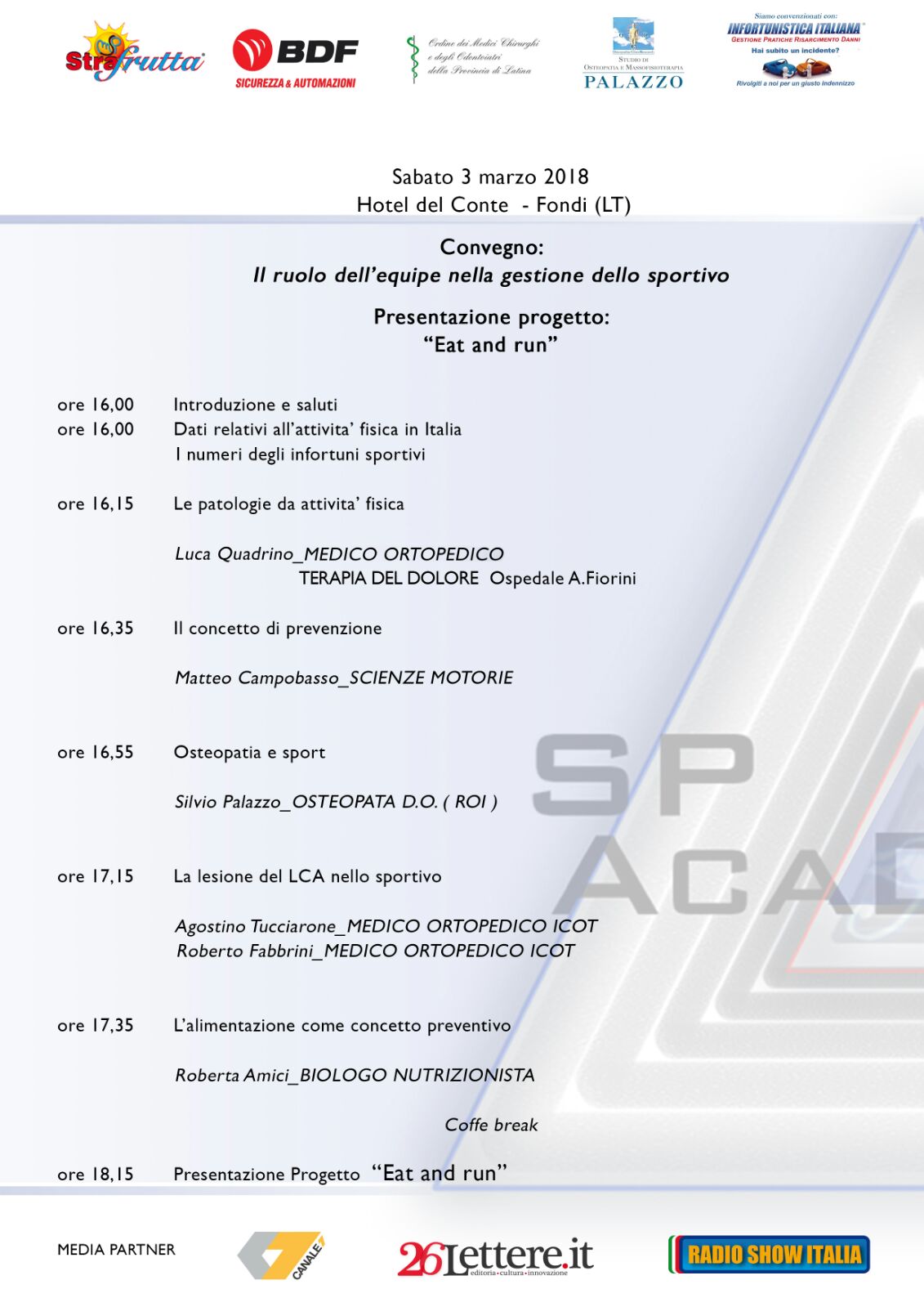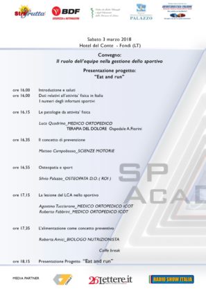 Si terrà domani, sabato 3 marzo, presso l’Hotel Del Conte a Fondi dalle ore 16 il convegno organizzato dalla SP Academy dal titolo: “Il ruolo dell’equipe nella gestione dello sportivo”. La SP Academy asd è una giovane associazione sportiva dilettantistica che nasce dall’esigenza di creare un supporto medico alle società sportive stesse e non solo. Formata da vari professionisti del settore sportivo e sanitario, l’associazione persegue l’importante scopo di creare i giusti concetti sul movimento fisico e sul corretto stile nutrizionale dell’individuo. Non a caso, dopo il convegno ci sarà la presentazione di un progetto molto importante dedicato ai più piccoli. L’obiettivo della SP Academy asd è quello di utilizzare il lavoro fisico sotto le varie forme per tutte le persone di qualsiasi età con o senza deficit. La persona al centro del progetto, con una attenta analisi da parte di vari professionisti: dal medico al nutrizionista, dal laureato in scienze motorie all’Osteopata, in un concetto globale di visione olistica. Il convegno, promosso in sinergia con l’istituto scolastico comprensivo Amante e Aspri di Fondi, e patrocinato dall’Ordine dei Medici di Latina, illustra nella prima parte i comportamenti da seguire verso uno sportivo da parte dei vari operatori sanitari e sportivi. Nell’introduzione verranno presentati una serie di dati relativi all’attività fisica in Italia e i numeri degli infortuni sportivi. Subito dopo il dott. Luca Quadrino (Medico Ortopedico – Terapia del dolore Ospedale Fiorini di Terracina) parlerà delle “Patologie da attività fisica”. Matteo Campobasso, Scienze motorie, descriverà il “concetto di prevenzione”. L’Osteopata Silvio Palazzo parlerà del ruolo “dell’Osteopatia nello sport”. I dottori Agostino Tucciarone e Roberto Fabbrini, medici ortopedici dell’Icot di Latina parleranno della “Lesione del LCA nello sportivo”. “L’alimentazione come concetto preventivo” sarà invece il tema affrontato dalla biologa e nutrizionista Roberta Amici. Dopo il coffe break, la presentazione del progetto “Eat and run” chiuderà il convegno. L’evento è reso possibile grazie al supporto di: StraFrutta, BDF sicurezza e automazione, Studio Palazzo, Infortunistica Italiana. Media Partner: Canale7, Radio Show Italia e 26 Lettere.it.