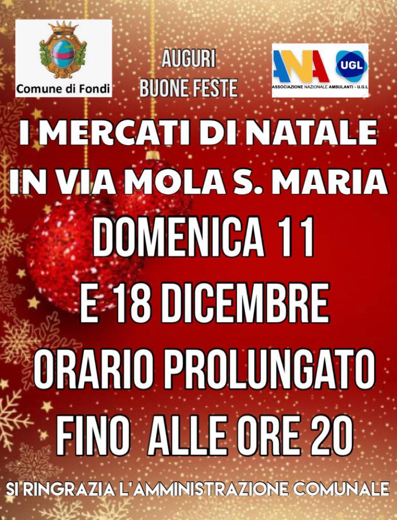 Dopo il successo dello scorso anno e in vista delle festività natalizie, torna a Fondi il mercato settimanale con orario prolungato. Domenica 11 e domenica 18 dicembre, come richiesto dall’Associazione Nazionale Ambulanti e come disposto con apposita ordinanza del sindaco, le attività mercatali in via Mola di Santa Maria si svolgeranno per l’intera giornata dalle 7:00 alle ore 20.00.