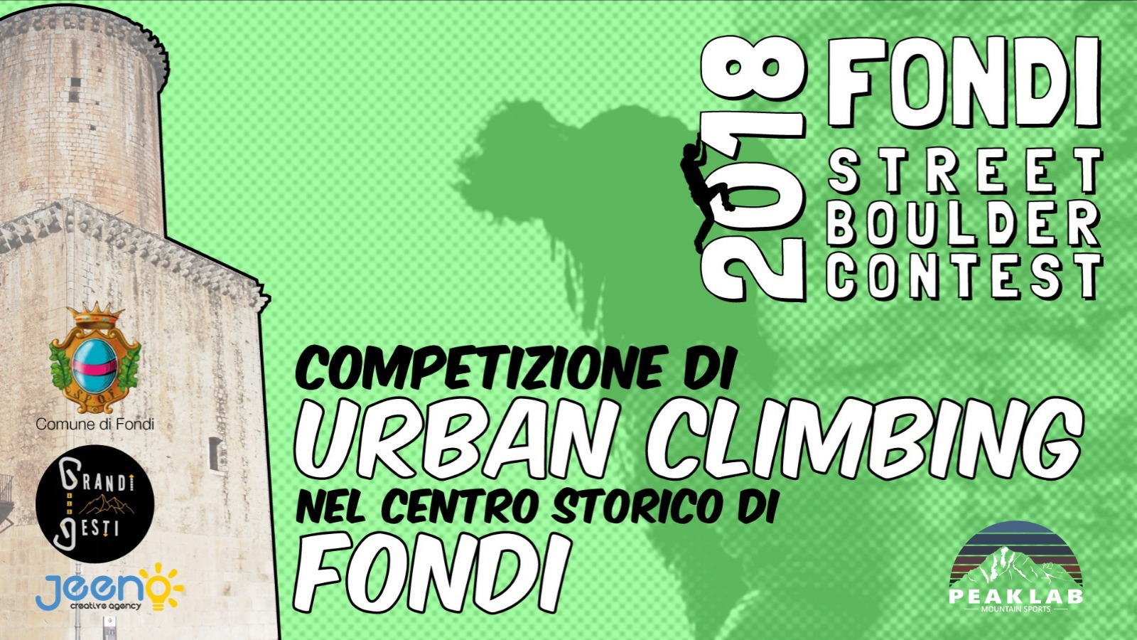 Arriva a Fondi per la prima volta lo Street-Boulder Contest.  Il 20 ottobre 2018 gli appassionati di questa disciplina sportiva avranno l’opportunità di provarsi con la prima competizione di arrampicata urbana tra le mura del suggestivo centro storico della città pontina. Un evento organizzato da Grandi Gesti ASD, Peak Lab Mountain Sports di Lorenzo Trento e patrocinato dal Comune di Fondi.