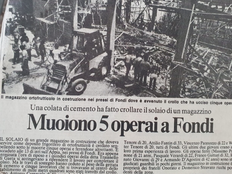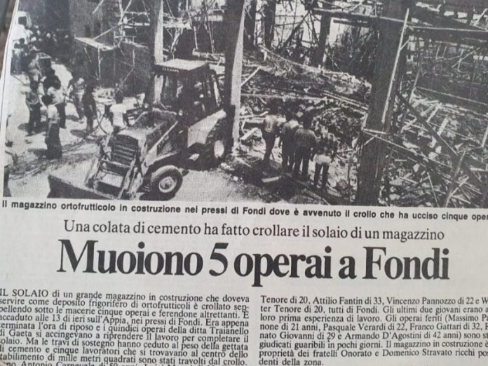 Ricorrerà il prossimo sabato 9 luglio il 40esimo anniversario dall’evento drammatico che sconvolse tutta la città di Fondi. Nel 1982 il crollo di un solaio provocò la morte di 5 operai ed il ferimento di altre 7 persone.