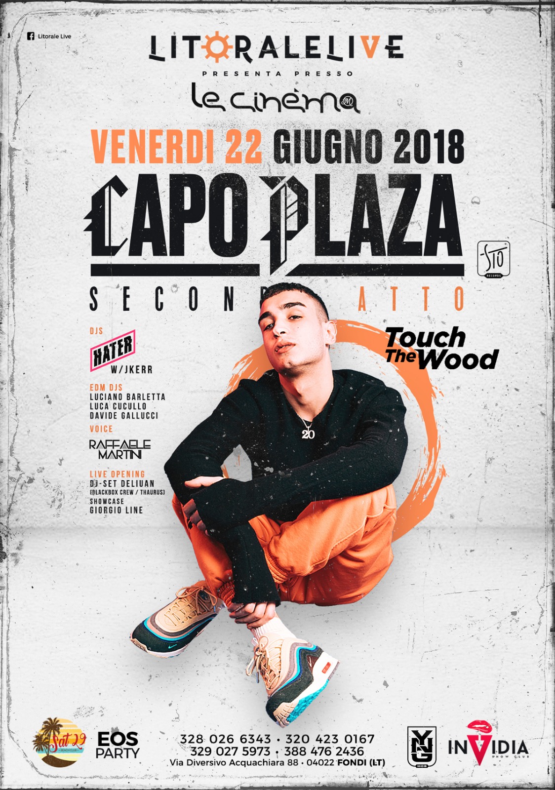 Ha solo 20 anni, ma la sua fama ha già fatto il giro d’Italia. Luca D’Orso, in arte Capo Plaza, arriva sul palco de Le Cinemà, a Fondi, alle 22.00 di Venerdì 22 Giugno per offrire una serata all’insegna del ritmo sfrenato della musica Rap.