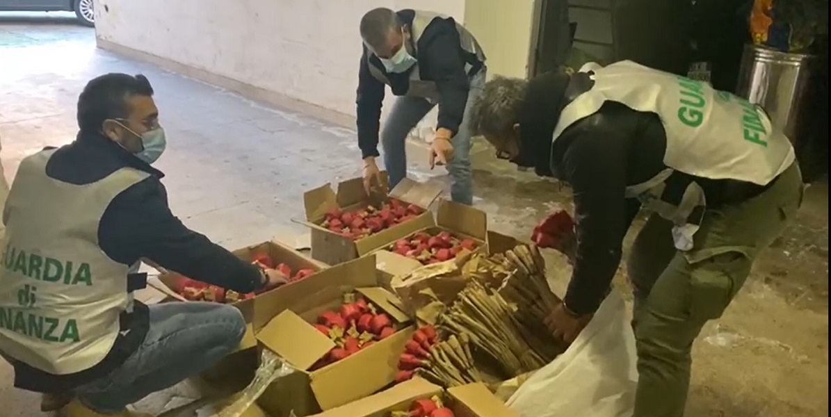 La perquisizione ha permesso di rinvenire un ammontare di circa 65 chili di ordigni pirotecnici illegali, artigianalmente confezionati. Gli “articoli”, estremamente pericolosi in considerazione proprio della produzione “casalinga” e della carica esplosiva, erano stati approvvigionati in vista delle imminenti festività di fine anno e avrebbero potuto fruttare, approssimativamente, oltre 10.000 euro una volta immessi sul mercato.