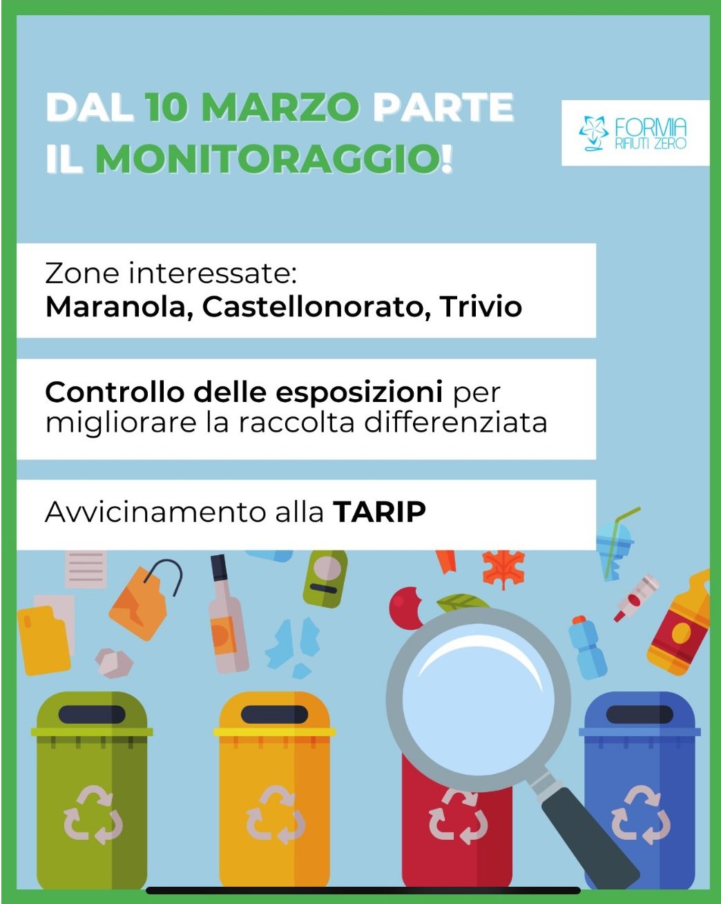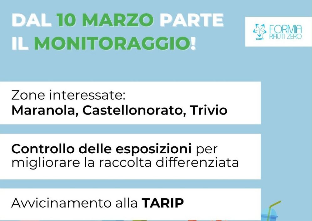 A partire da lunedì 10 marzo, nelle zone di Maranola, Castellonorato e Trivio inizierà la misurazione della frequenza di conferimento della raccolta indifferenziata, un passo fondamentale verso l’introduzione della Tariffa Puntuale (TARIP). Lo fa sapere Formia Rifiuti Zero.