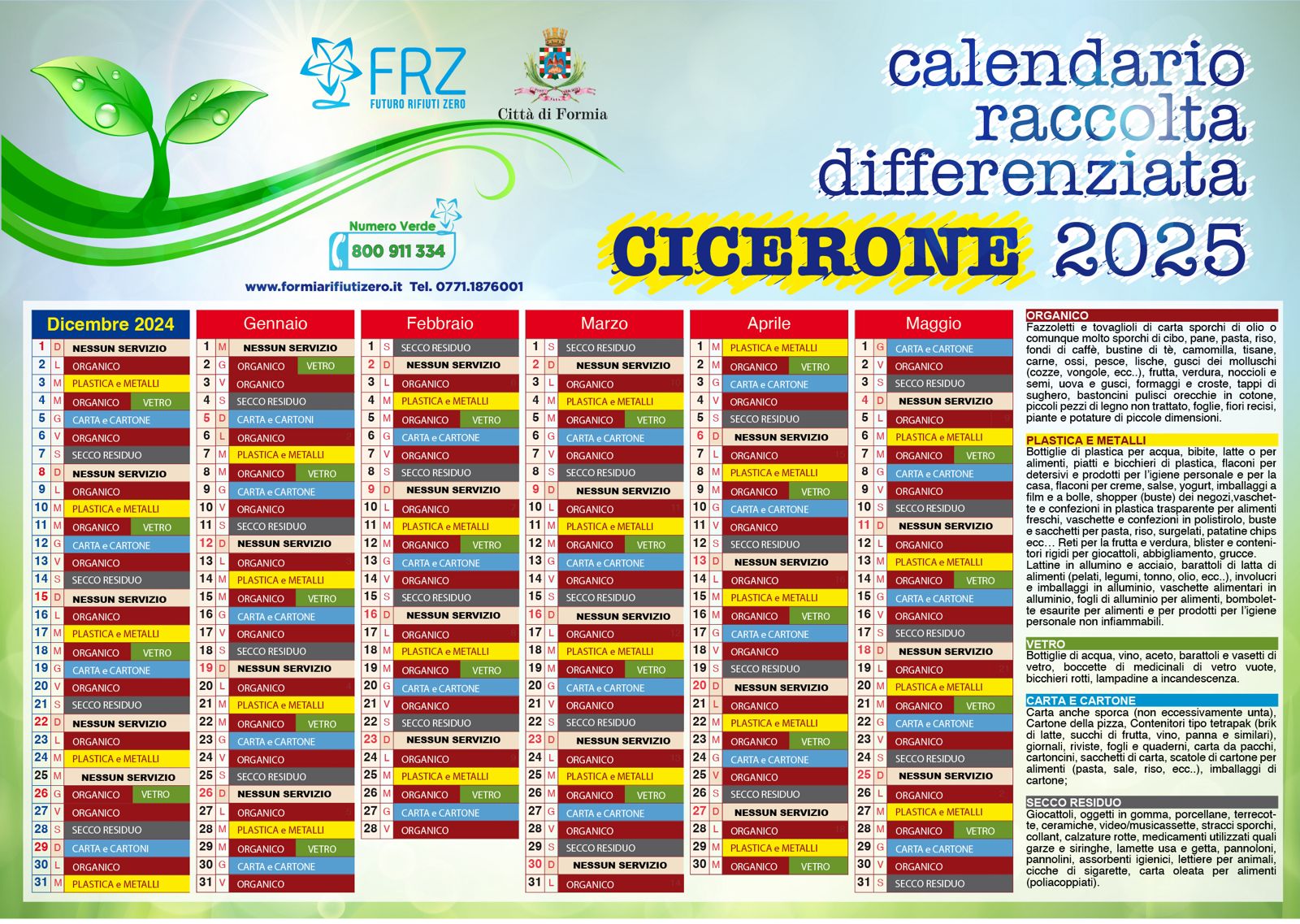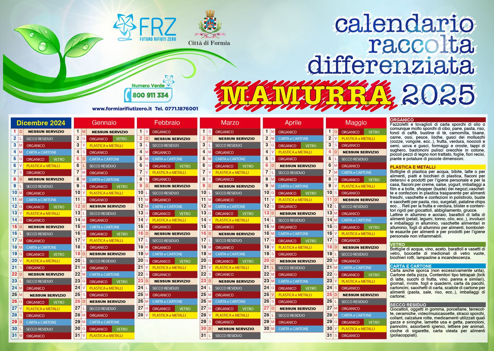 Da giovedì 12 dicembre sarà avviata la distribuzione dei calendari per la raccolta differenziata 2025 nel Comune di Formia. I calendari saranno consegnati nei condomini e saranno disponibili anche online sul sito ufficiale di Formia Rifiuti Zero, suddivisi per le due zone di raccolta, Mamurra e Cicerone.
