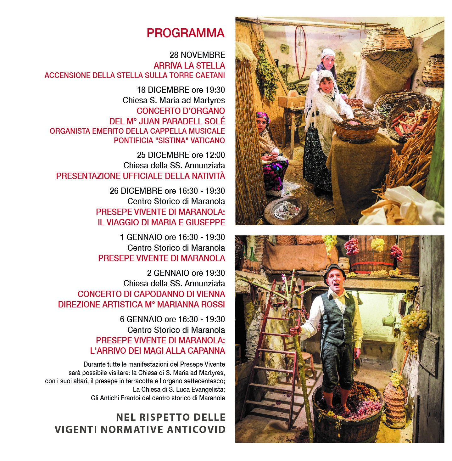 Si ricorda infine che durante tutte le manifestazioni del Presepe Vivente sarà possibile visitare: la Chiesa di S. Maria ad Martyres, con i suoi altari, il presepe in terracotta e l’organo settecentesco; La Chiesa di S. Luca Evangelista; Gli Antichi Frantoi del centro storico di Maranola.