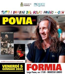 Alle ore 17.00, la piazza Largo Paone si animerà con il vibrante concerto (ingresso libero) del talentuoso artista Povia, introdotto dalla coinvolgente performance della band Mimì & Bagaria, un gruppo che da anni porta in giro il suo sound mediterraneo e che annovera nelle sue fila Mimì Varriale e Tony Montanaro (di Formia), musicisti impegnati nel sociale con il loro progetto Musica Gratis per i bambini del Golfo, tra l’altro promotori dello stesso evento. Povia, 51 anni, di Milano, che vinse l’edizione 2006 del celebre Festival di Sanremo con il brano “Vorrei avare il becco”, viene spesso considerato una figura atipica nel mondo della canzone italiana e durante la sua carriera ha conquistato 8 dischi di platino e 3 dischi d’oro, oltre a detenere il record di maggior numero di settimane consecutive alla posizione numero 1 nelle classifiche nazionali con il pezzo “I bambini fanno ooh”.
