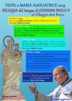 Tanti gli appuntamenti durante la settimana per accompagnare la preziosa reliquia del Papa Santo: mercoledì alle 19.00 la messa con la benedizione dei bambini da 0 a 3 anni e dei loro genitori; giovedì alle 19.00 la messa con la benedizione degli ammalati; venerdì alle 15.00 la partenza del pellegrinaggio fino a Gaeta per salire a monte Orlando verso la statua di Maria Ausiliatrice collocata dai devoti di don Bosco.