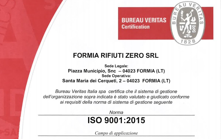 Per ottenere tale certificazione Formia Rifiuti Zero ha predisposto un dossier con la definizione di tutti i processi aziendali in corso, che è stato successivamente avvalorato dal prestigioso ente di certificazione “Bureau Veritas” che ha qualificato l’azienda come conforme ai criteri di qualità stabiliti dalla norma internazionale ISO 9001.