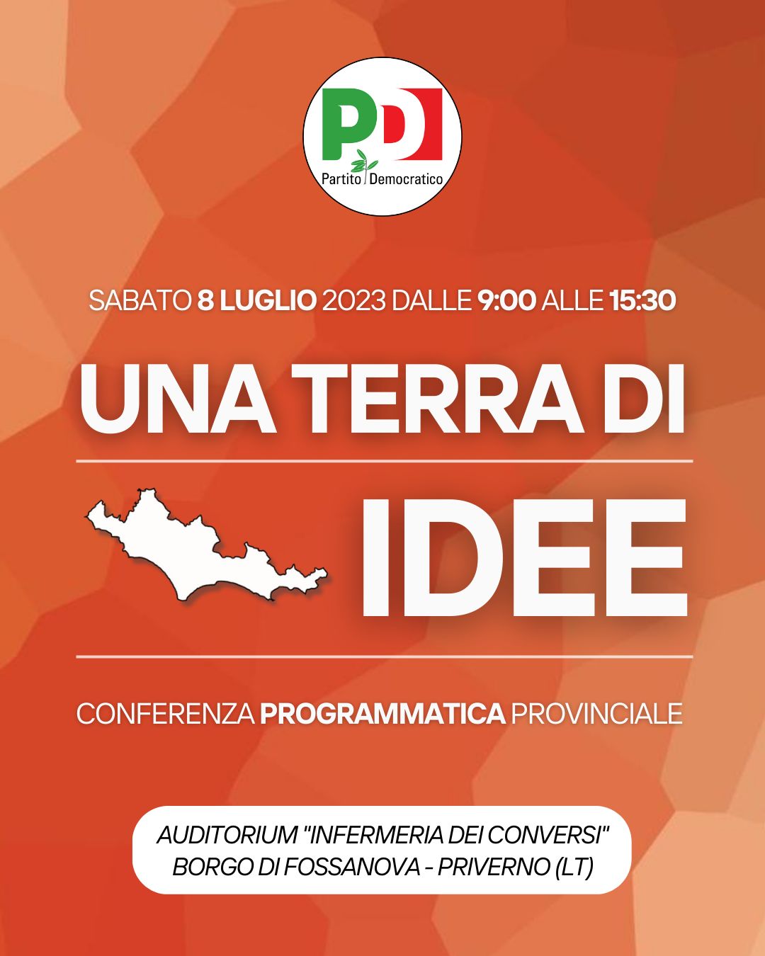 In apertura porteranno il loro saluto la Sindaca di Priverno, Annamaria Bilancia, il Segretario Regionale, Daniele Leodori, l’On. Matteo Orfini. “TERRA DI IDEE” è il titolo che abbiamo scelto per la nostra Conferenza. Perché vogliamo che le idee e il territorio tornino protagonisti del confronto politico provinciale. Dopo un anno di continue votazioni e congressi sentiamo il dovere di aggiornare e qualificare la nostra proposta programmatica ripartendo dal senso più profondo della nostra missione politica: prenderci cura del bene collettivo e rifuggire ogni tentazione di autoreferenzialità.