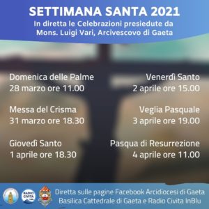 GAETA – Da domani 28 marzo, l’Ufficio per le comunicazioni sociali dell’Arcidiocesi di Gaeta curerà la trasmissione delle celebrazioni della Settimana Santa 2021, cuore di tutto l’anno liturgico della Chiesa. Le celebrazioni saranno presiedute dall’arcivescovo di Gaeta Luigi Vari e in diretta sui media diocesani. Questo il calendario delle celebrazioni: