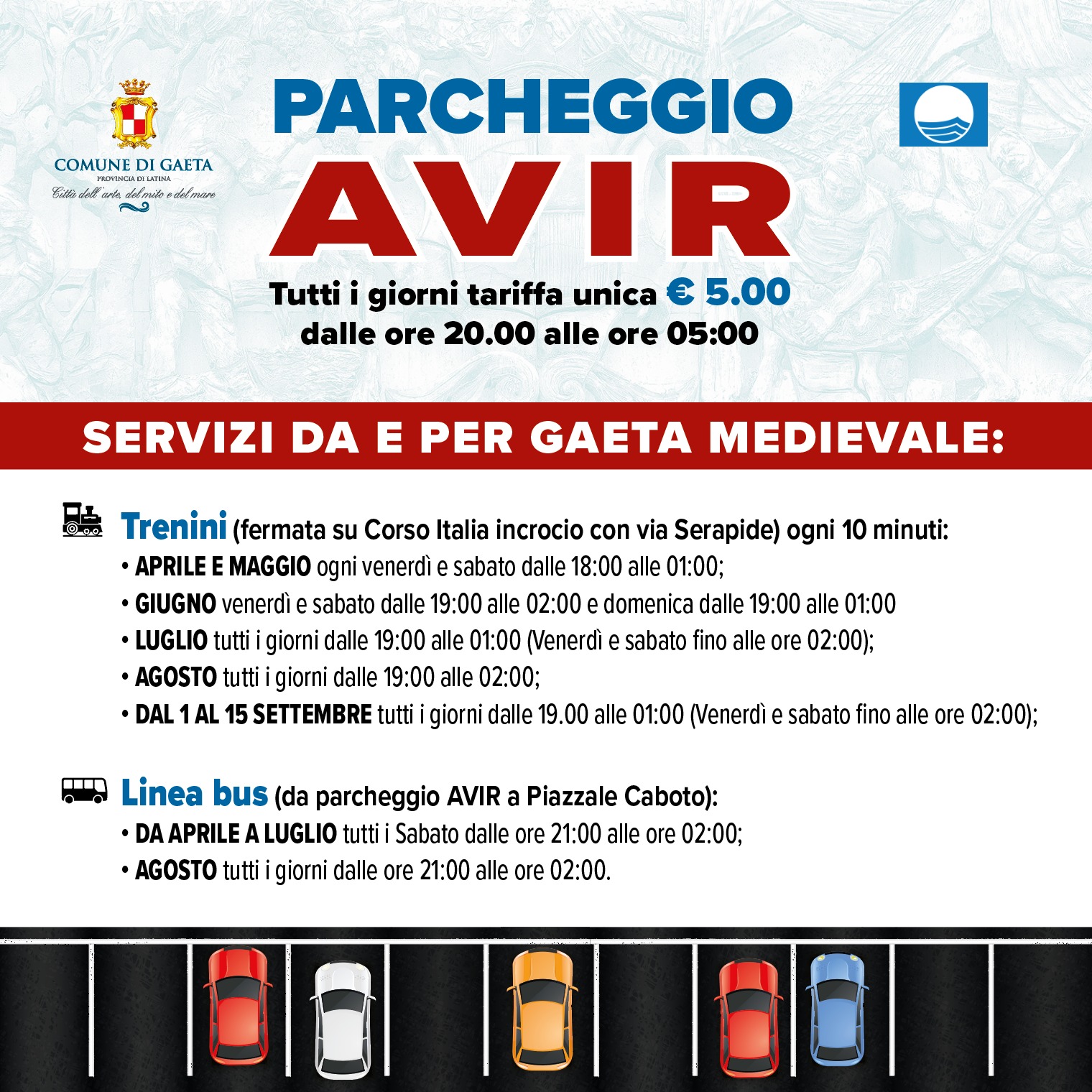 Attivo il nuovo servizio di trasporto con trenini e bus per recarsi comodamente nel centro storico di Gaeta Medievale, lasciando la macchina nell’ampio parcheggio AVIR.