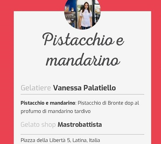 Vanessa Palatiello, della gelateria Mastrobattista di Latina, è finalista tra i 12 gelatieri del Lazio che i prossimi 11 e 12 marzo parteciperanno al campus della Carpigiani Gelato University ad Anzola Emilia. Si tratta della più importante scuola internazionale di gelateria scelta da 7.000 studenti ogni anno, che diventerà il teatro di un’avvincente sfida di gelateria che selezionerà i 4 vincitori che accederanno alla Finale Italiana di Gelato Festival World Masters nel 2021. Vanessa ha convito le giuria finora incontrate in questo percorso con il gusto “Pistacchio al profumo di mandarino tardivo”.