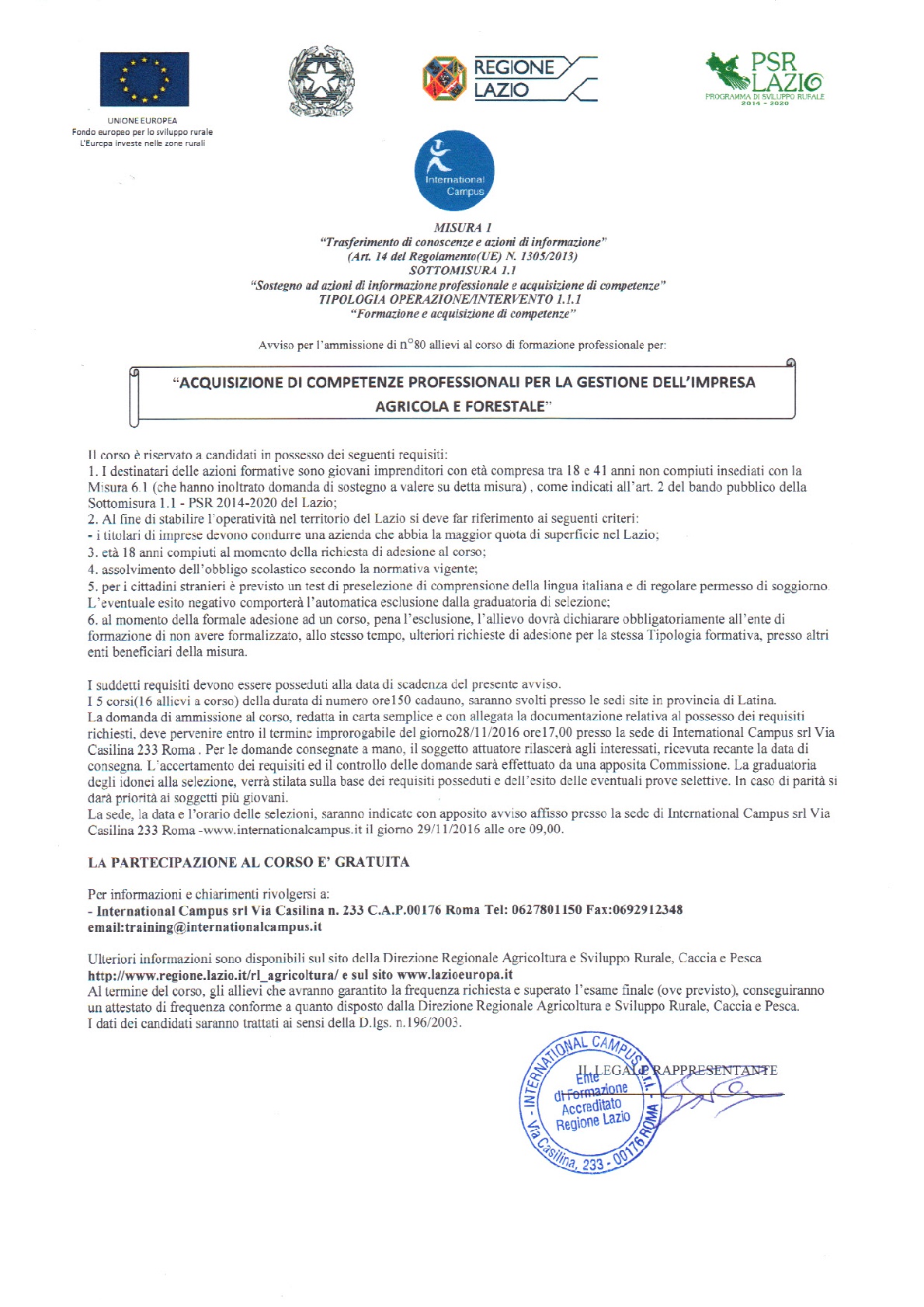 I futuri manager delle imprese agricole passano anche attraverso nuovi modelli di formazione. “Acquisizione di competenze professionali per la gestione dell’impresa agricola e forestale” è il titolo di cinque corsi organizzati dall’International Campus nell’ambito delle azioni formative messe in campo dall’Unione Europea con i Piani di Sviluppo Rurale e attuate dalla Regione Lazio. I destinatari delle misure sono operatori giovani imprenditori del settore agricolo e forestale in età compresa tra i 18 e i 41 anni non compiuti.