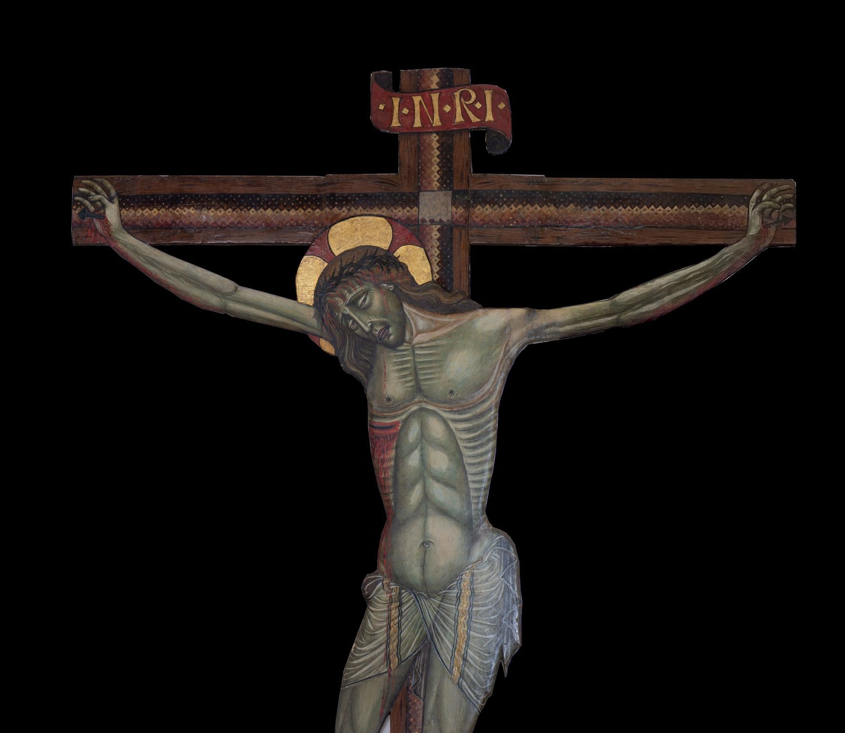 Il soggetto rientra pienamente nella tipologia del crocifisso gotico-doloroso: si tratta di un’iconografia trecentesca, incentrata sulle componenti più drammatiche e patetiche dell’episodio anche grazie all’approfondimento del tema nell’ambito dei testi apocrifi e delle sacre rappresentazioni teatrali, che trovava ancora diffusione nella metà del XV secolo.