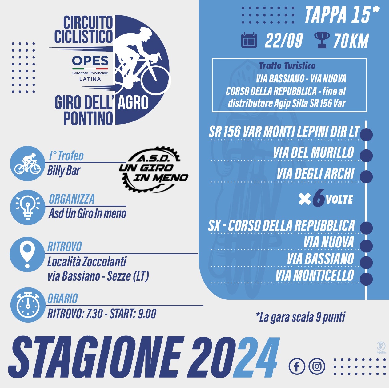 Il “Giro dell’Agro Pontino” Opes prosegue con le sue tappe caratterizzate dai bellissimi territori in cui conduce gli atleti in gara. Al via l’evento di calendario numero quindici, il I° Trofeo Billy Bar organizzato dalla asd “Un Giro In Meno”, in programma a Sezze per domenica 22 settembre 2024.